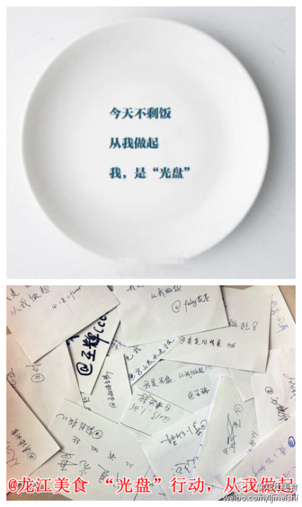 The abundance of wasted food in China – a country where some are struggling even to meet their nutritional needs – has prompted an online campaign against food squandering, as pointed out by a recent tweet from Xinhua. Below are two images circulating the Weibosphere as part of the "clean plate campaign":