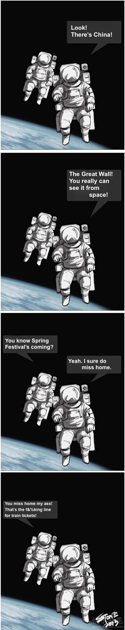 | I Can See Your Mom from Space Posted: 27 Jan 2013 03:31 PM PST Every year, China's rail system is seized by Chunyun (春运), the mad rush to get home in time for the Chinese New Year (also called Spring Festival). For millions of rural migrants on the country's factory floors and construction sites, this is the one chance to see family all year long. Chunyun begins about two weeks before Spring Festival and lasts for almost a month after; it is a wave of humanity whose participants exceed China's total population in number [zh]. The lines to buy train tickets can truly reach epic proportions. This year, Spring Festival falls on February 10. The race is about to begin. You cannot really see the Great Wall from space, by the way.  By Mr. Stone (@二混子–Stone). Via CDT Chinese. © Anne.Henochowicz for China Digital Times (CDT), 2013. | Permalink | No comment | Add to del.icio.us Post tags: Great Wall, political cartoons, political humor, Spring Festival, transportation Download Tools to Circumvent the Great Firewall  |