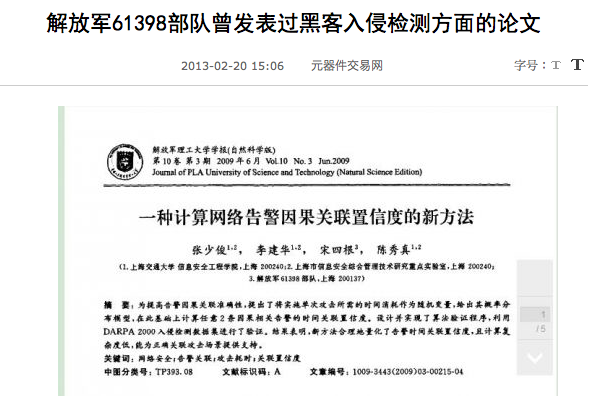 An academic paper published in the Journal of PLA University of Science and Technology (Natural Science Edition) coauthored by a member Unit 61398, titled "Novel Method to Calculate Causal Correlation Belief Values of Network Alerts." Keywords: network security, alert correlation, attack time expense, and correlation belief. You can view the paper's cover page, which includes an English abstract, through this link. Chinese IT and Internet information portal Cecb2b.com reported on this paper [zh] in light of the New York Times piece:
